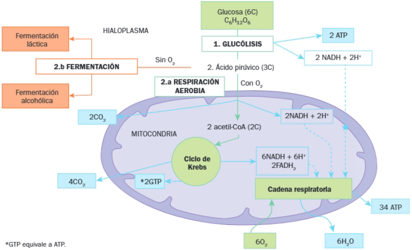 - Etapa 1: Glucólisis, que degrada glucosa a piruvato y, además, se obtienen 2 ATP y 2 NADH.