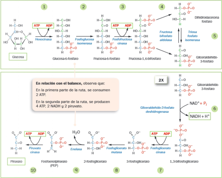 - En la segunda parte, ambas triosas acaban convertidas en piruvato. Por eso, la segunda parte se produce dos veces (una por cada triosa).