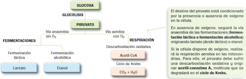 Se observa que tanto las fermentaciones como la respiración necesitan de un primer proceso, una ruta metabólica común en ambas: la glucólisis, que tiene lugar en el hialoplasma y en la que se obtiene ácido pirúvico o piruvato.