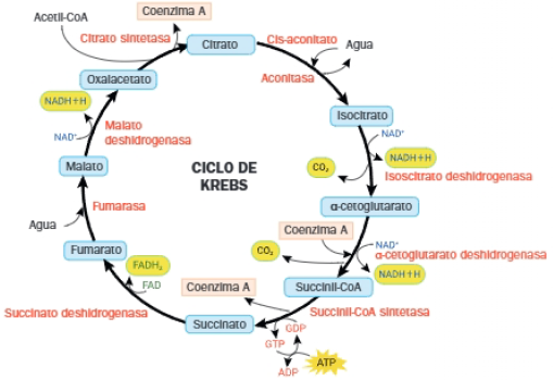 El ciclo de Krebs es una ruta antibólica que, en la respiración aerobia, realiza la degradación del acetil-CoA a CO2, a la vez que se genera GTP y coenzimas reducidas (NADH y FADH2).