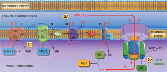 - Etapa 1: NADH y FADH2 ceden electrones a la cadena transportadora de electrones situada en las crestas de la membrana mitocondrial interna. Los componentes de la cadena son proteínas de membrana con grupos prostéticos capaces de aceptar y ceder electrones y están agrupadas en 4 complejos supramoleculares o sistemas; el NADH cede electrones al complejo I y el FADH2 al complejo II.
