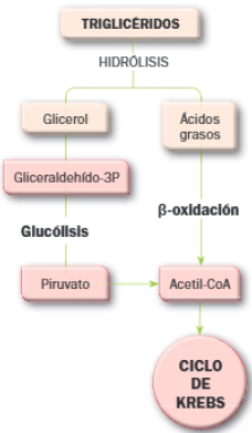 Los triglicéridos son moléculas de reserva energética a las que la célula puede recurrir para obtener energía. El primer paso es la hidrólisis, de la cual resulta glicerol y tres ácidos grasos. El glicerol se transforma en gliceraldechído-3-fosfato y, de este modo, se incorpora a la glucólisis.