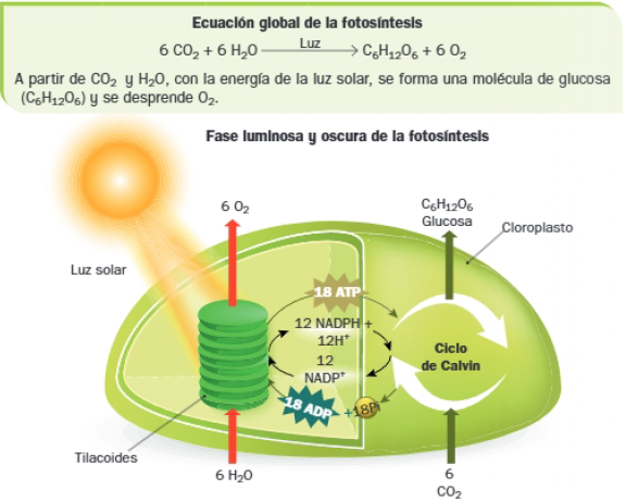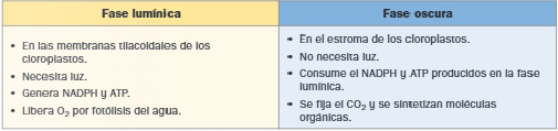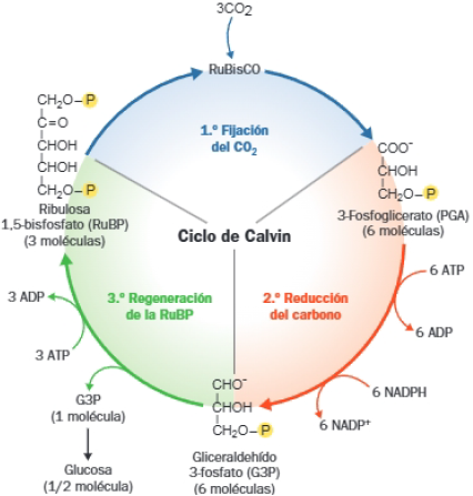 - Reducción del carbono fijado a gliceraldehído-3-fosfato, lo cual requiere aporte de energía (ATP) y poder reductor (NADPH) generados en la fase lumínica.