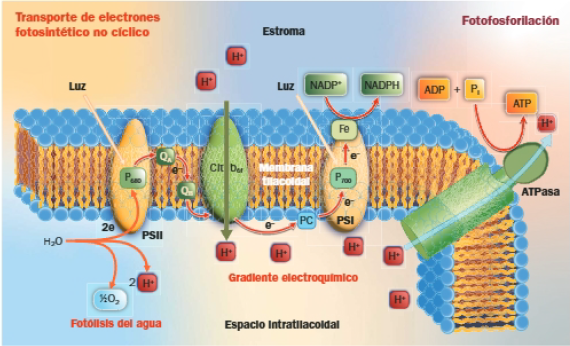 - En el paso de los electrones a través de la cadena central de transportadores de electrones se libera energía, utilizada para bombear H+ al interior del tilacoide; el gradiente electroquímico generado activa la ATPasa, al retornar los H+ al estroma a través de ella.