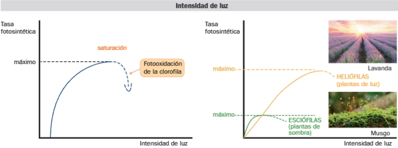 A bajas intensidades lumínicas, un aumento de estas conlleva una mayor tasa fotosintética. Superado el óptimo puede llegar a la saturación e incluso al deterioro de la clorofila por fotooxidación, con la consiguiente disminución de la intensidad de fotosíntesis. El máximo de intensidad de luz varía de unas especies a otras. Las especies esclófilas están adaptadas a bajas intensidades de luz, son plantas de sombra. Las especies hellófilas necesitan intensidades de luz elevadas, son plantas de sol.
