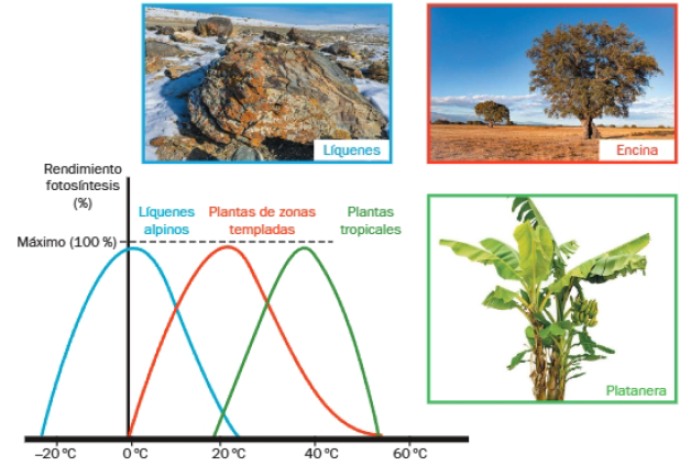 La temperatura óptima varía de unas especies a otras. Así, especies de zonas alpinas tienen máximos de rendimiento fotosintético a temperaturas próximas a 0 grados centigrados, mientras que las especies de clima tropical presentan máximos a unos 40 grados centígrados.