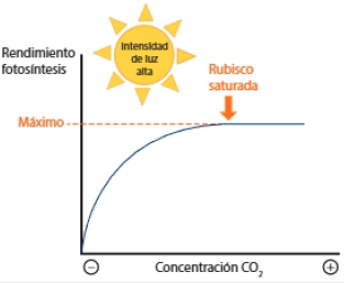 La enzima alcanza la velocidad máxima cuando todos los centros activos de todas las moléculas en de enzimas están ocupados. Se dice que la rubisco está saturada.