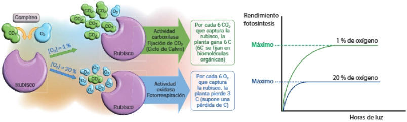 El O2 compite con el CO2 como sustrato de la enzima rubisco. Si es alta, se activa la FOTORESPIRACIÓN: proceso en el que la rubisco, en vez de actuar fijando CO2, captura O2, en un proceso de oxidación que supone una pérdida de átomos de carbono. Así, niveles altos de O2 en la planta suponen un menor rendimiento de la fotosíntesis.