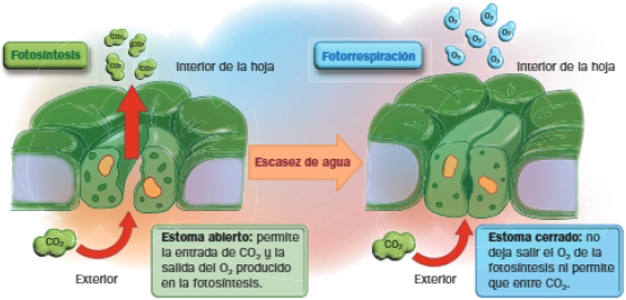Ante la escasez de agua, los estomas se cierran para evitar pérdidas de la misma. Esto provoca que el CO2 disminuya, mientra que el O2 generado en el interior de la hoja, activando la actividad oxidasa de la rubisco, la fotorrespiración, y disminuyendo el rendimiento fotosintético.