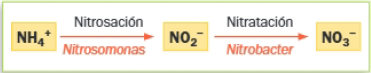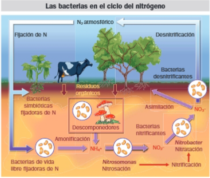 - Bacterias de nitrógeno: Resultan imprescindibles en el ciclo del nitrógeno. Realizan la nitrificación, que consiste en la oxidación del amonio a nitrato. Son bacterias aerobias que utilizan el O2 como agente oxidante. Se trata de microorganismos autótrofos que utilizan el CO2 atmosférico como fuente de carbono. La nitrificación tiene lugar en dos etapas: