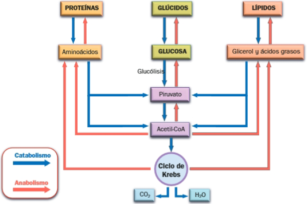 El catabolismo está conformado por una serie de rutas metabólicas convergentes: todas las degradaciones convergen en el denominado ciclo de Krebs, que se desarrolla en la matriz mitocondrial y supone la degradación total de la materia orgánica a inorgánica, tal y como se muestra en el siguiente esquema general del catabolismo: