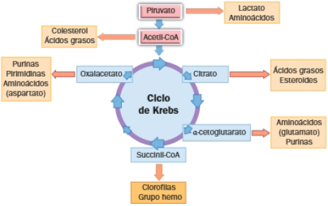 Muchas de las moléculas intermediarias del ciclo de Krebs pueden ser dirigidas hacia procesos de biosíntesis de biomoléculas, es decir, hacia rutas anabólicas.