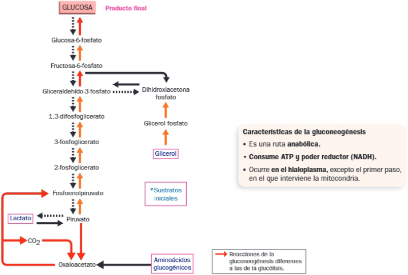 Ocurre cuando la célula no dispone de la glucosa que necesita. Comparte la mayoría de las reacciones de la glucólisis, pero en sentido contrario, aunque las enzimas que catalizan las reacciones en un sentido (glucólisis) o en el contrario (gluconeogénesis) son diferentes.