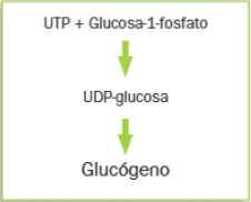 Para que tenga lugar la síntesis de glucógeno, las glucosas deben ser activadas, en forma de UDP-glucosa; esto se logra al reaccionar la glucosa-1-fosfato con el nucleótido UTP. La síntesis de glucógeno se realiza por adición de unidades de glucosa, siendo la molécula donadora la UDP-glucosa. La reacción está catalizada por la enzima denominada glucógeno sintasa.
