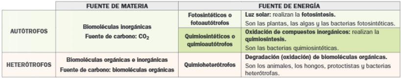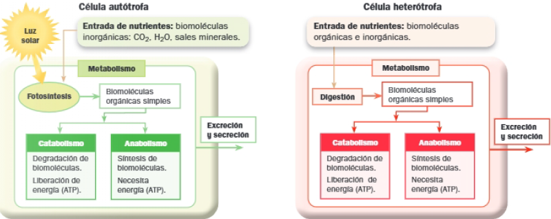 Se distinguen dos modalidades de metabolismo en función de la fuente de materia y de energía utilizadas, que permite clasificar a los organismos y/o las células en función de ellas.