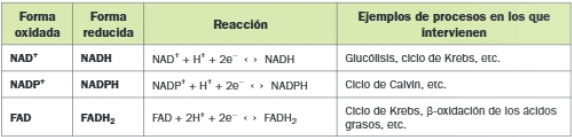 Determinadas coenzimas actúan como intermediarias entre las reacciones de oxidación y las de reducción, debido a su facilidad para captar o ceder hidrógenos. Las principales son: