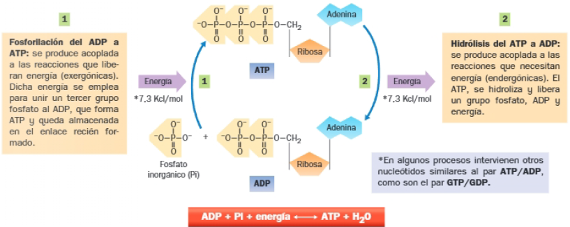 El mecanismo de transferencia de energía más utilizado por las células es el denominado ciclo del ATP-ADP, que implica la formación y rotura de enlaces ricos en energía entre los grupos fosfato 2 y 3 del ATP.