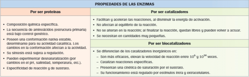 Las enzimas poseen propiedades derivadas de su naturaleza proteica y del hecho de ser catalizadores de las reacciones químicas de los seres vivos.