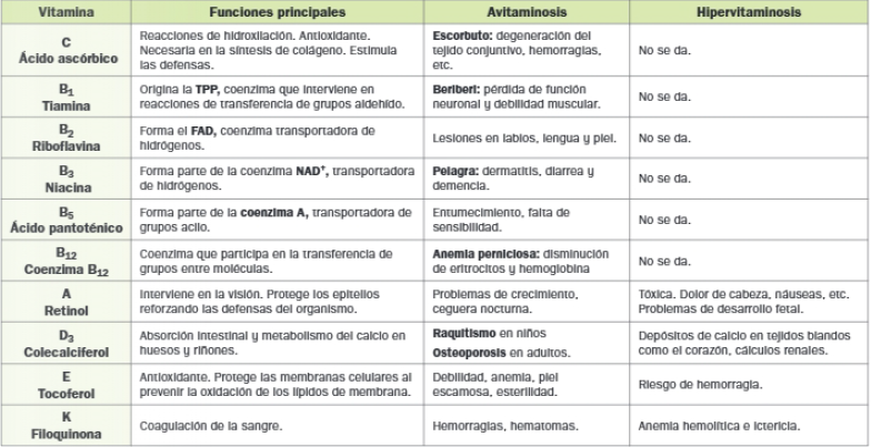 Las vitaminas son un grupo de compuestos de naturaleza muy variada, la mayoría de las cuales actúan como coenzimas y grupos prostéticos de las enzimas. Sin las coenzimas y grupos prostéticos, no es posible la activación de numerosas enzimas; por lo tanto, las vitaminas resultan imprescindibles.