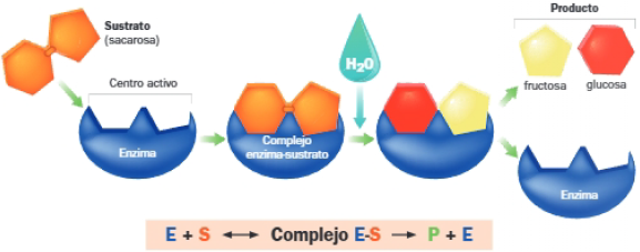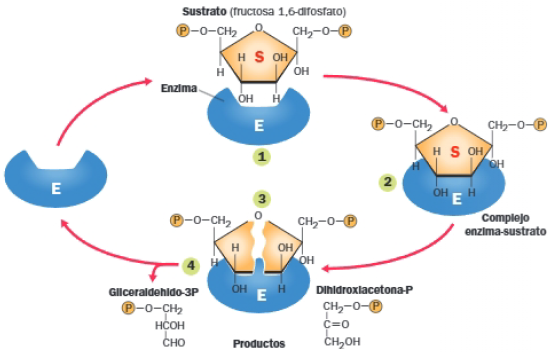 Las enzimas actúan sobre sustancias denominadas sustratos, que se unen a la enzima en un lugar concreto denominado centro o sitio activo; la unión del sustrato a la enzima genera el complejo enzima-sustrato. Las enzimas facilitan que los sustratos se sitúen con la orientación óptima para que la reacción se produzca. La unión al centro activo de la enzima lleva al sustrato al estado de transición, de modo que determinados enlaces se vuelven inestables y se forman otros nuevos, que originan los productos; al finalizar la reacción, el producto se separa de la enzima. La enzima libre puede actuar de nuevo.