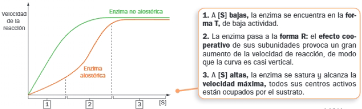• Presentan una cinética diferente a las enzimas no alostéricas, en relación con la concentración de sustrato; la gráfica es una curva sigmoidea: