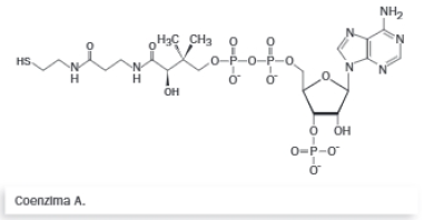 La coenzima A está formada por el ácido pantoténico (vitamina B5) unido a un ADP y a una cadena corta de etilamina unida a un grupo tiol. La parte activa de la molécula es el grupo tiol. Su función es transportar grupos acilo, que juegan un importante papel en el metabolismo.