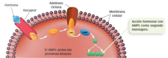 El AMPc se forma en las células a partir del ATP mediante una reacción catalizada por la adenilato ciclasa localizada en la membrana celular cuando la hormona se une a su receptor de membrana. Actúa como segundo mensajero transmitiendo y amplificando las señales hormonales.