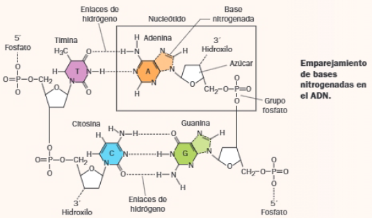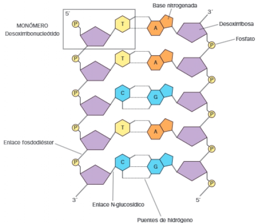 Queda matizar que el ADN está formado por dos largas cadenas poliméricas de desoxirribonucleótidos monofosfato de adenina, guanina y citosina. La secuencia de nucleótidos es su estructura primaria y la lectura de las cadenas se realiza en sentido 5′ a 3′.
