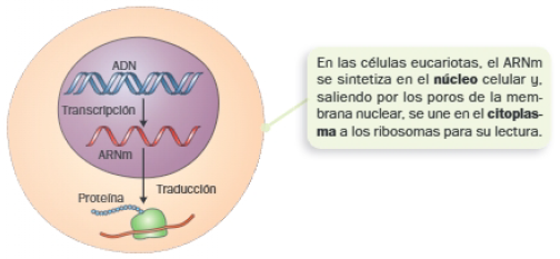 Se sintetiza por complementariedad de bases utilizando como molde un fragmento o gen de ADN que codifica para una proteína. El mecanismo de síntesis se denomina transcripción y la función de la molécula obtenida es trasladar dicha información al lugar de síntesis de proteínas.