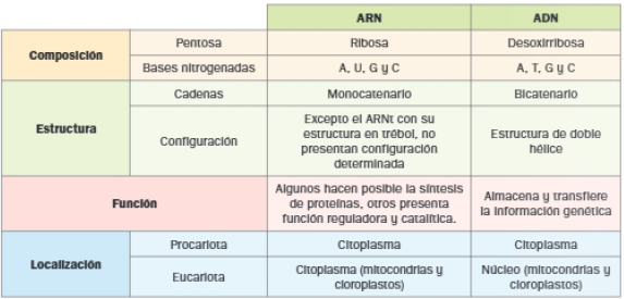 En la siguiente tabla comparativa se recogen las principales diferencias entre los ácidos nucleicos ADN y ARN: