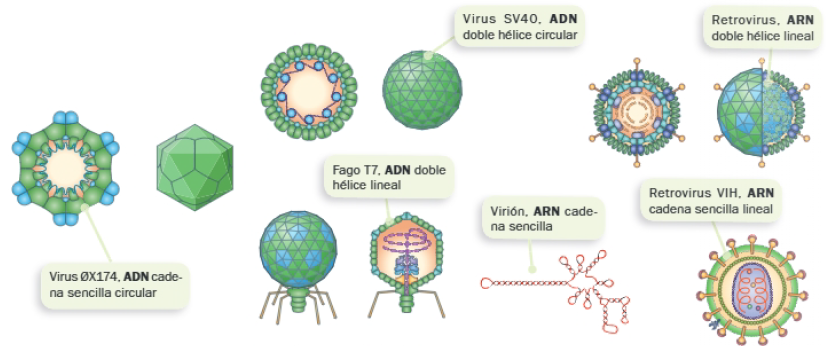 - Los virus portadores de ADN presentan, en la mayoría de los casos y con mayor diversidad, una molécula de ADN bicatenario rodeada de la cubierta proteica que constituye la cápside.
